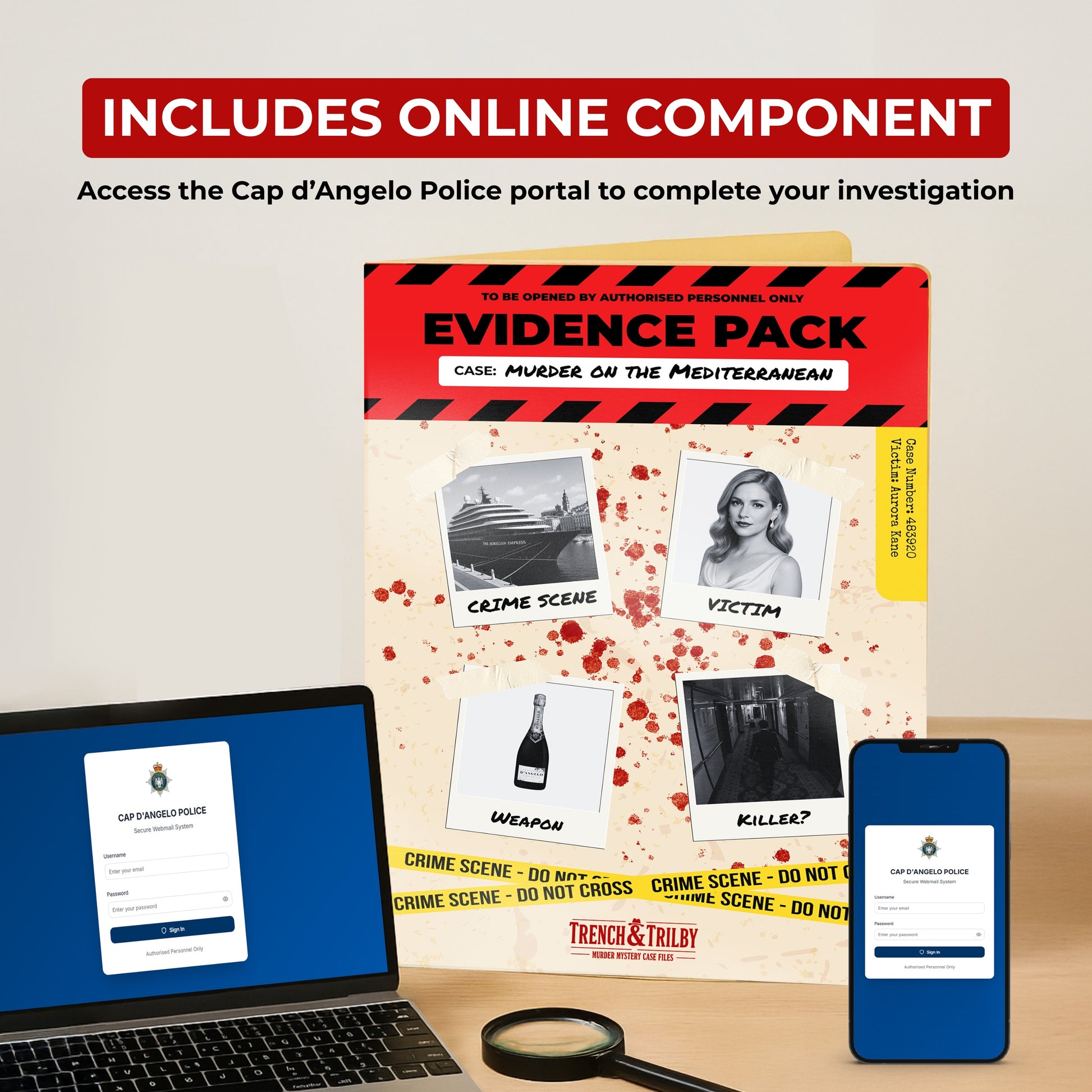 This is a physical case file delivered to you, containing over 25 pieces of realistic evidence. Some additional clues are accessed online as part of the investigation.