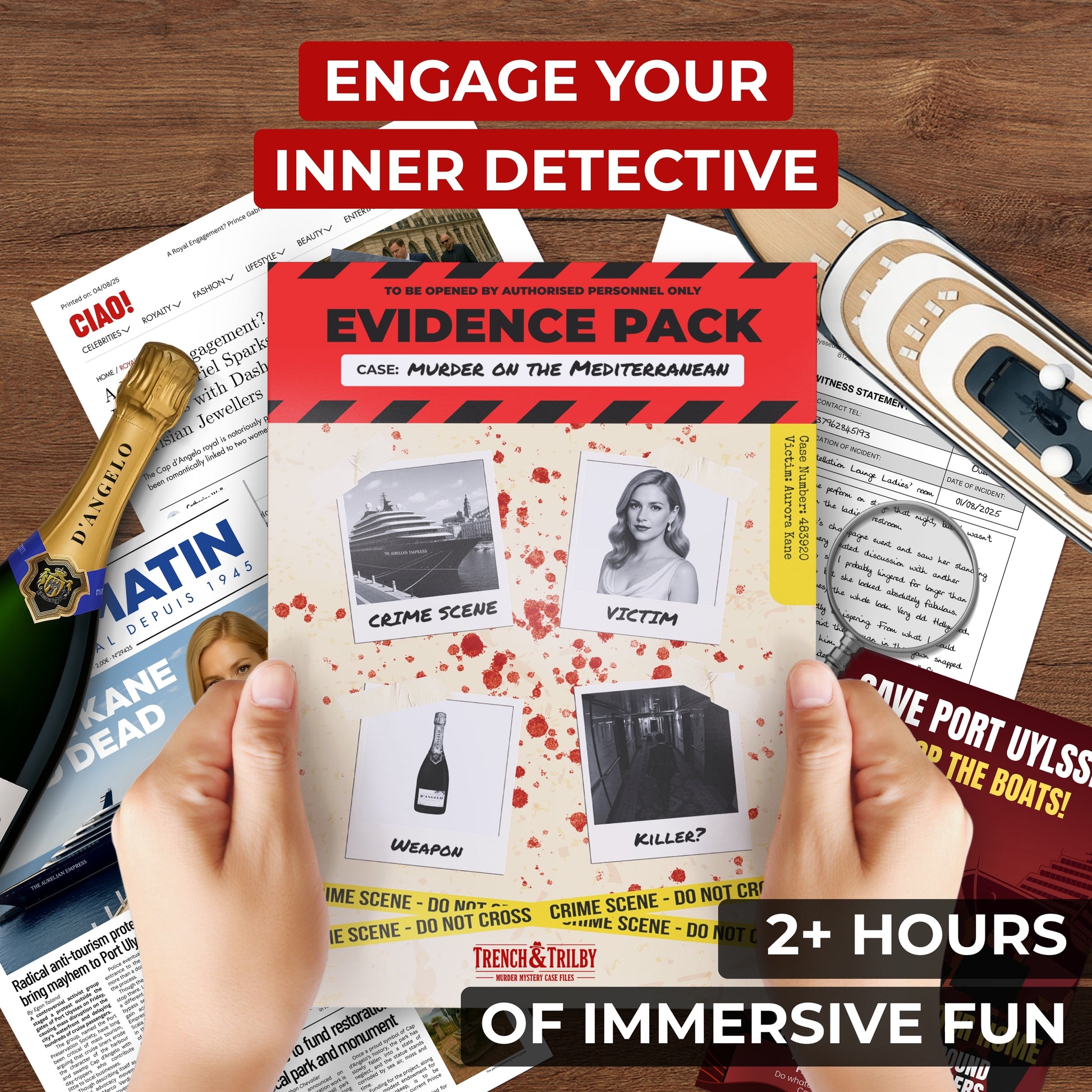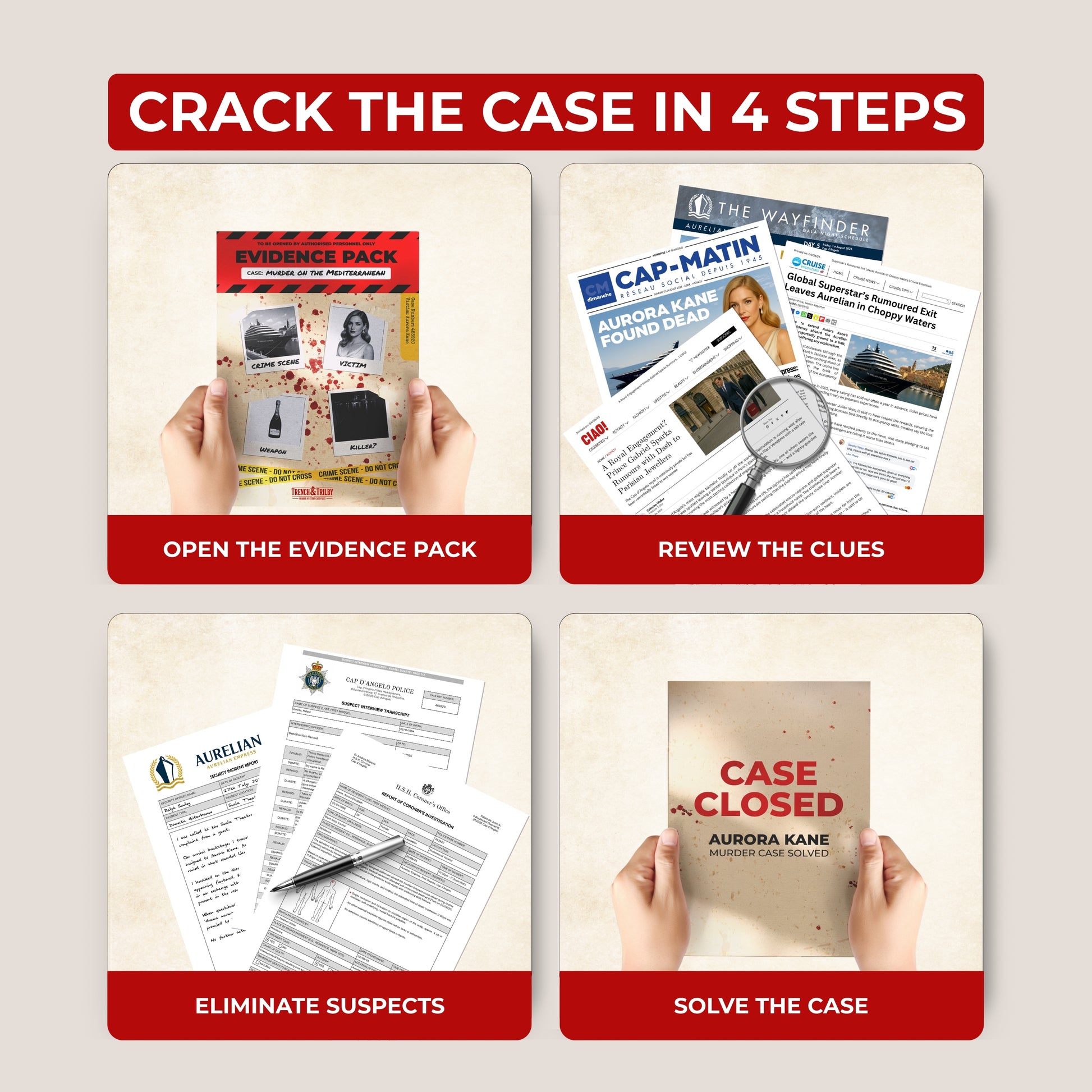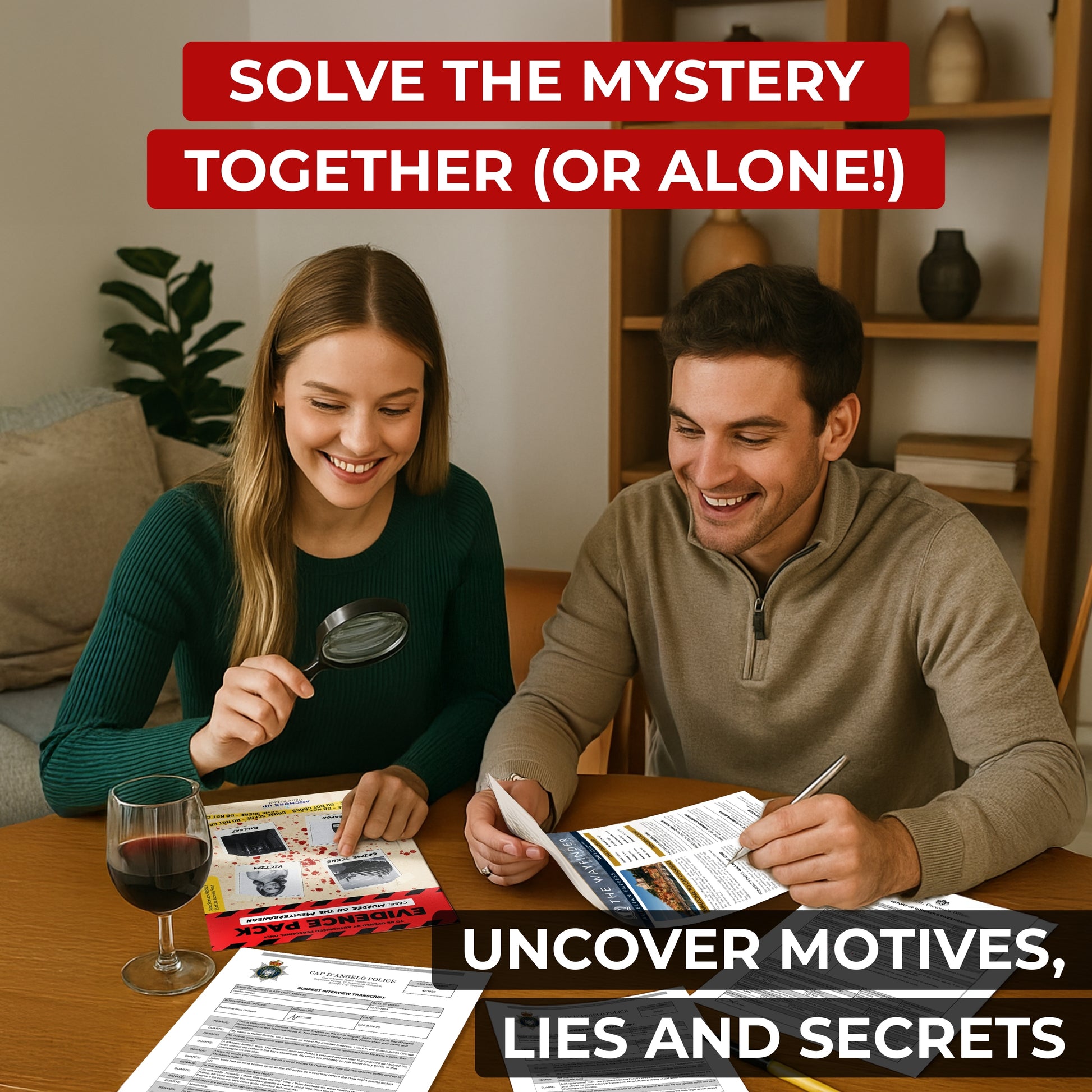 Murder on the Mediterranean is a realistic cold case murder mystery you solve at home. You investigate a fictional crime using physical evidence and online clues, just like a real detective.