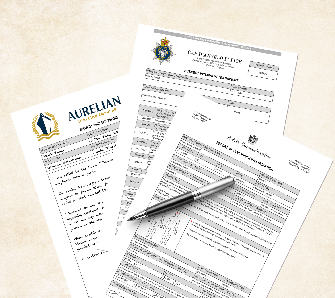 We create realistic murder mystery case file games.